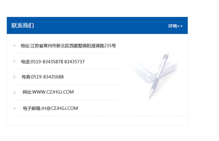 地址:常州市新北區(qū)友邦商務(wù)大廈1幢16、17層  電話:0519-85101652  傳真:0519-85112595  郵編:213022  網(wǎng)址:www_cz-jiayue_cn.kmbaize.com  郵箱:xiajifengaa@163.com